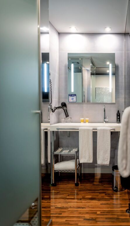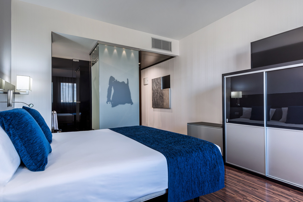 Una cama de matrimonio de 1,50 m x 2 m, una cómoda mesa de trabajo, minibar con agua de cortesía y butaca. Disponen de un original cuarto de baño con ducha transparente con efecto lluvia, secador, aire acondicionado, calefacción, caja fuerte gratuita, teléfono y TV con mas de 20 canales.